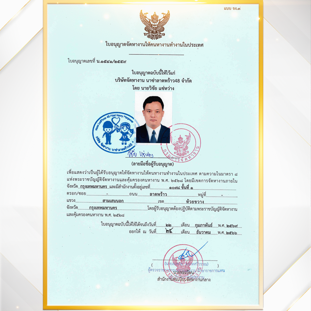 บริษัทของเรามีใบอนุญาตถูกต้องตามกฏหมายการจัดหาแรงงาน ไม่ใช่บริษัทค้าแรงงานเถื่อน นายจ้างเชื่อถือได้แน่นอน